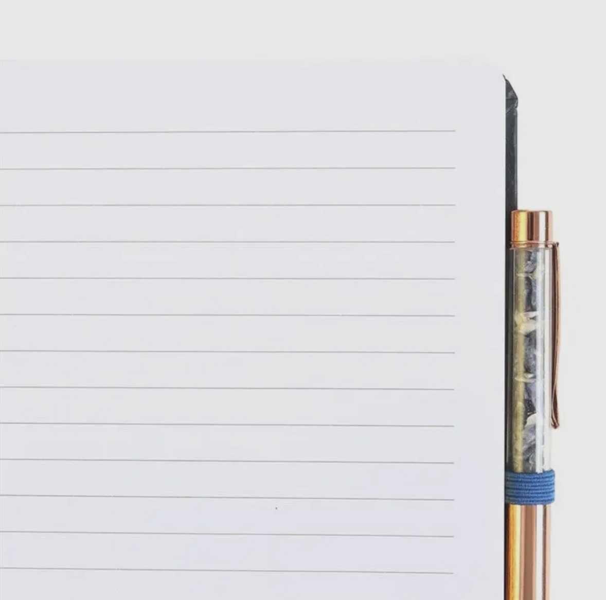 elegant kulspetspenna med sodalitkristall. Sidorna är dekorerade med