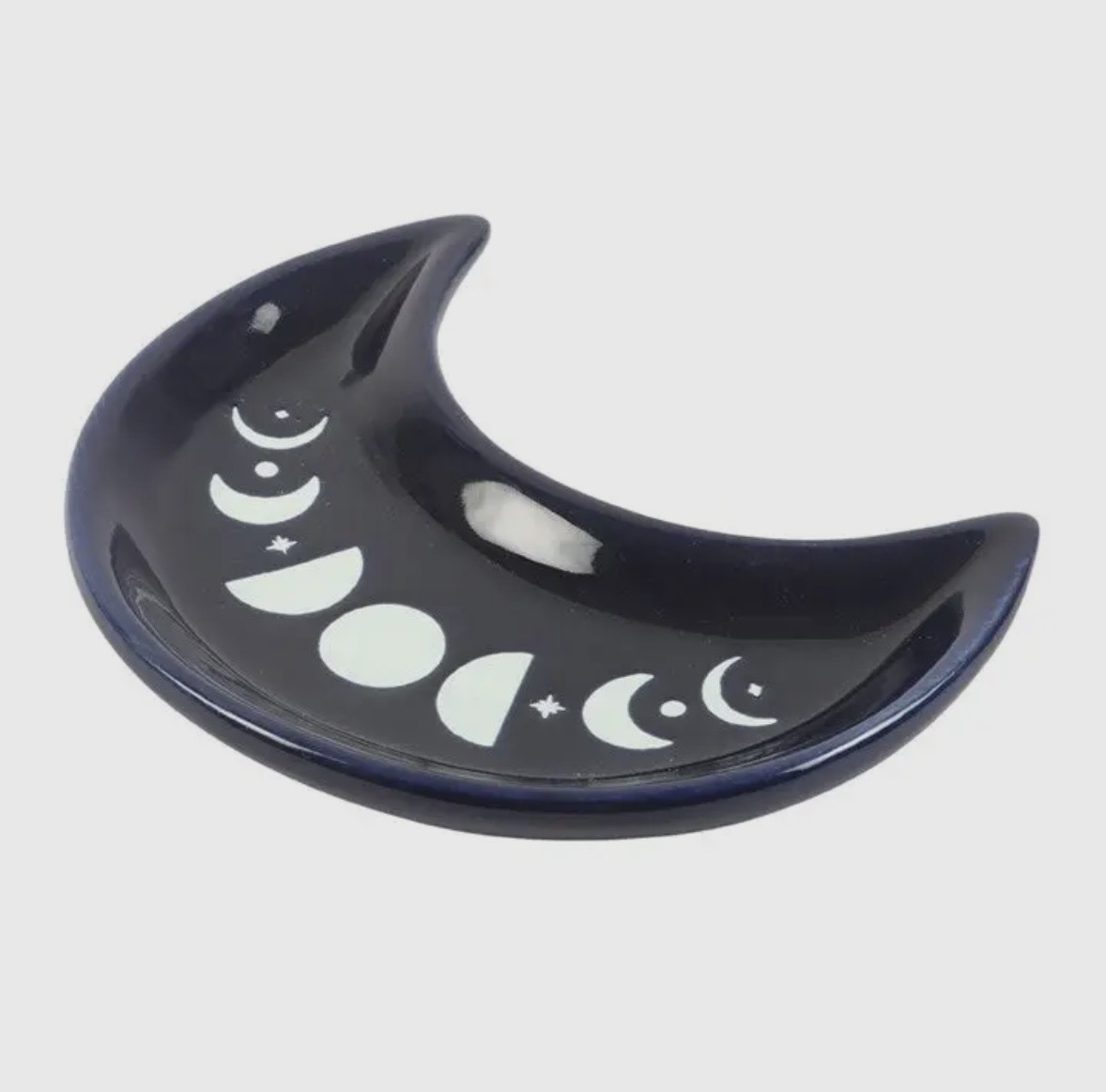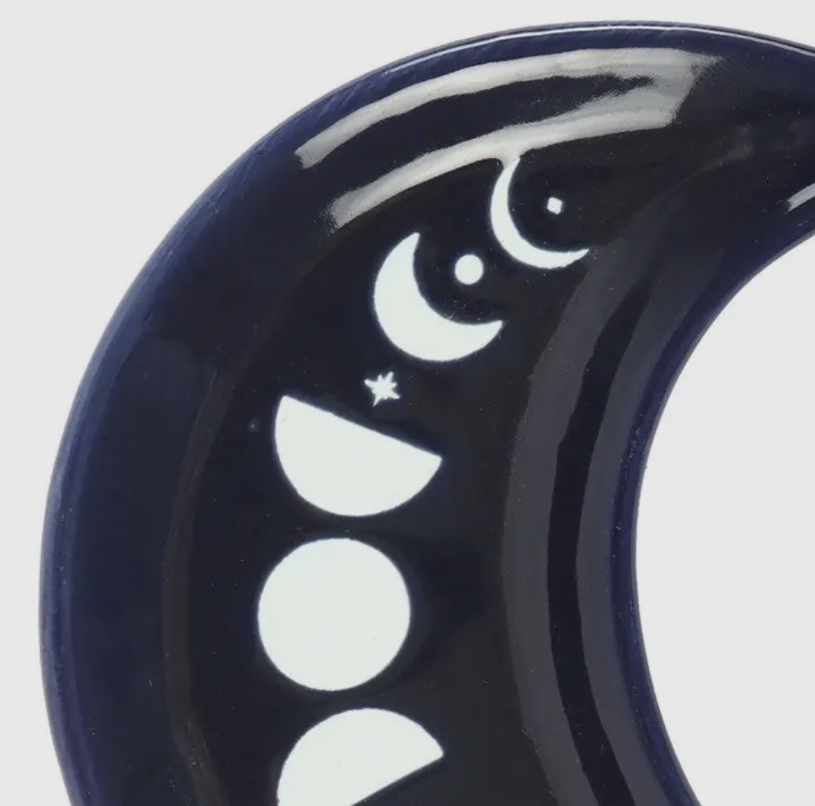 Denna halvmåneformade prydnadsskål är dekorerad med ett månfasmotiv,
