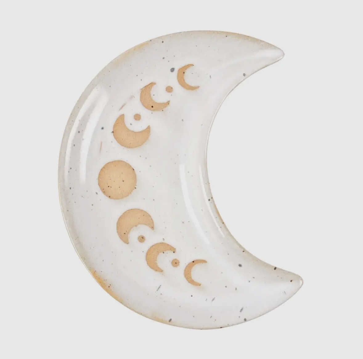 Ett vackert fat av stengods i form av en månskära. Fatet har ett
