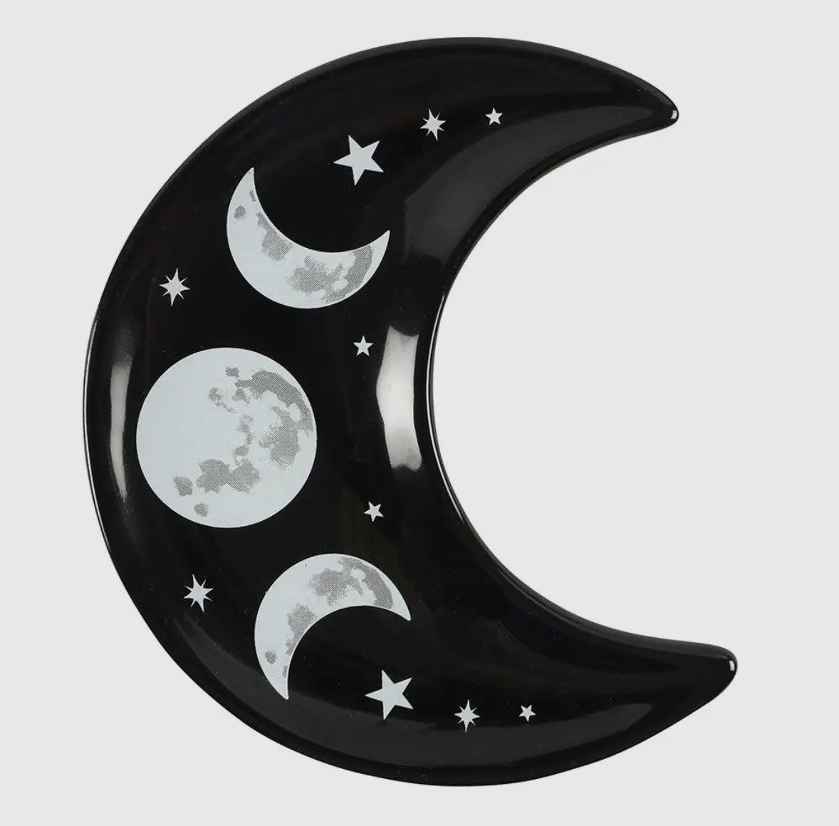 Detta keramiska smyckesfat är format som en halvmåne och prytt med en häftig trippel månsymbol. Perfekt för förvaring av smycken och mindre accessoarer.