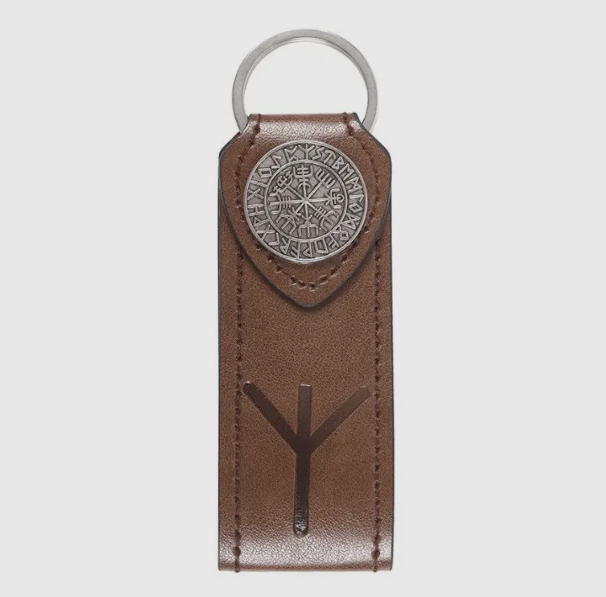 Denna symboliska runnyckelring representerar skydd, med den kraftfulla Algiz-runan och en detaljerad metallkompass på en flik av konstläder. En omtänksam gåva för resenärer och entusiaster av vikingaarv.