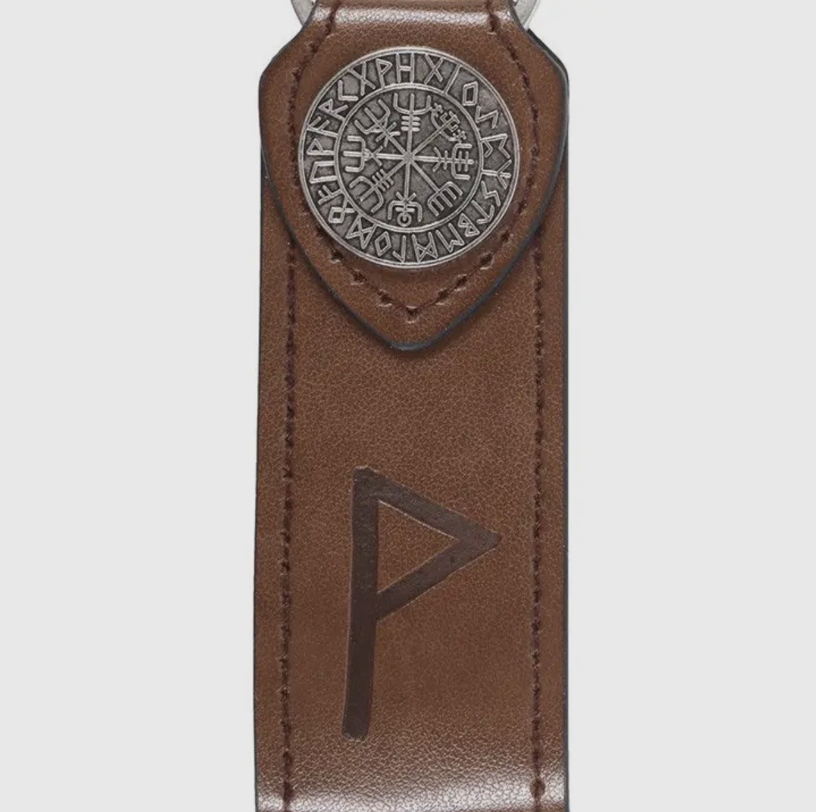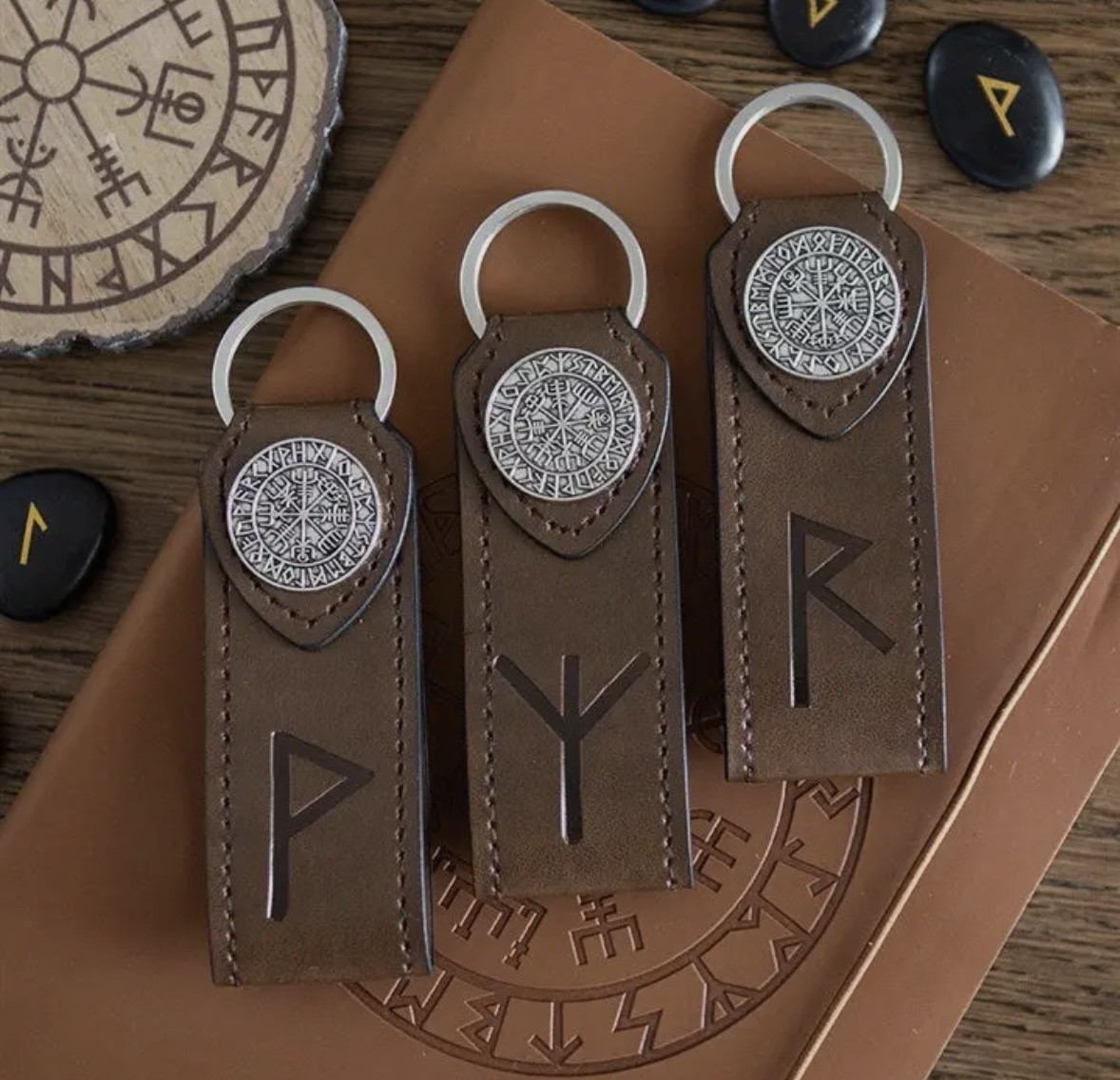 vikingarun-nyckelring, prydd med en detaljerad metallkompass på en flik