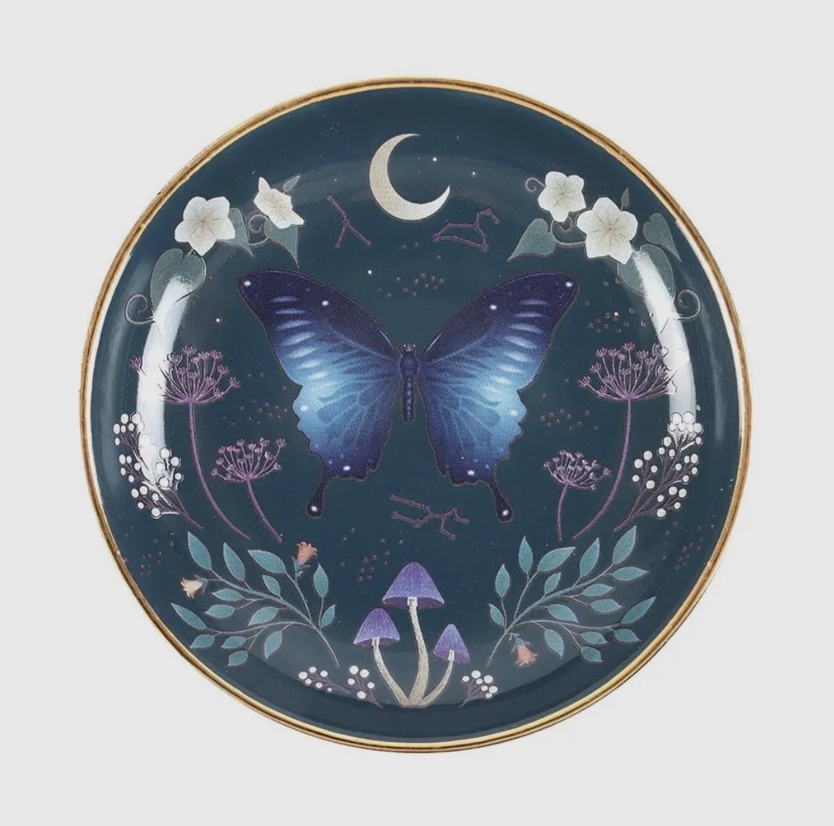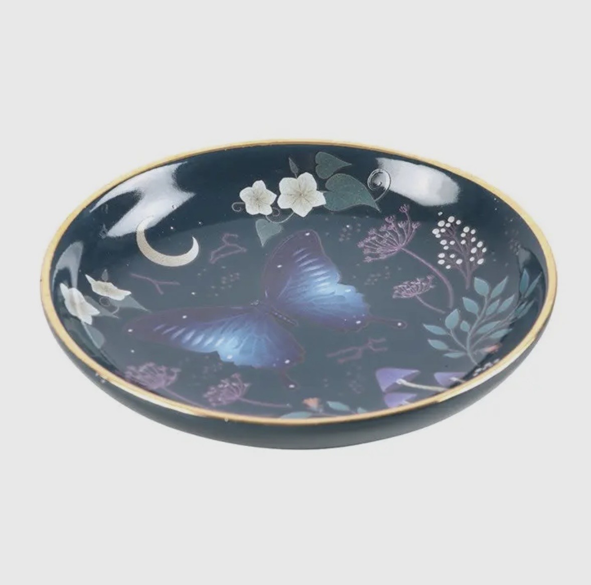 Denna förtrollande smyckesskål pryds av en vacker midnattsfjärilsdesign i