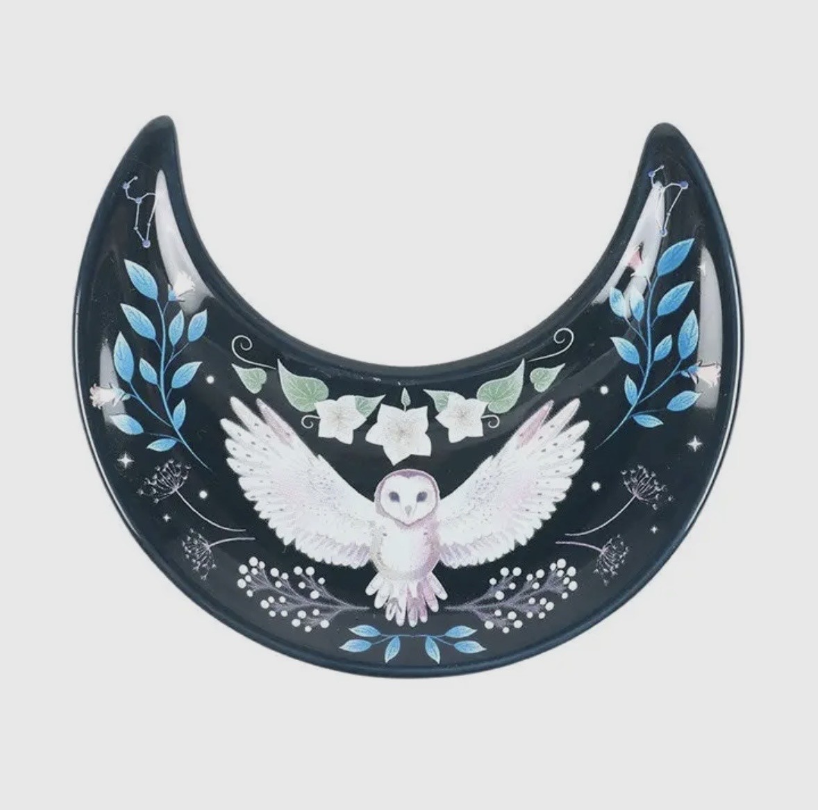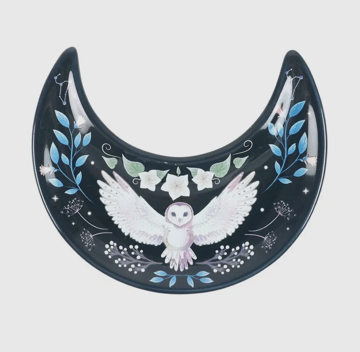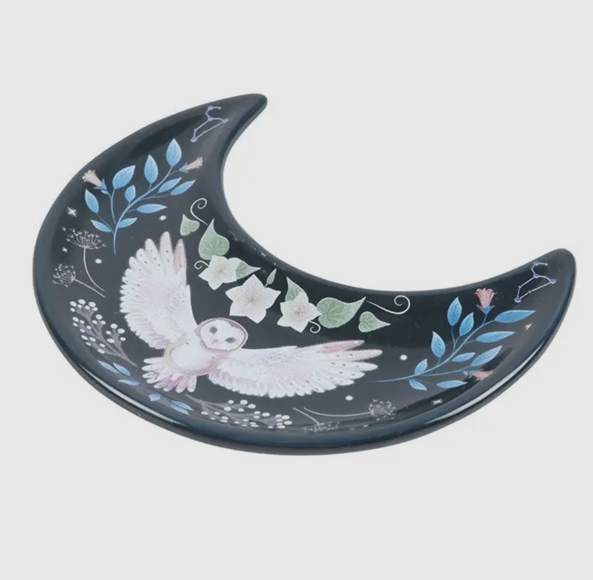 Detta keramiska smyckesfat är format som en halvmåne och pryds av en flygande nattuggla omgiven av skogsväxter. Perfekt för att förvara smycken och andra små accessoarer.